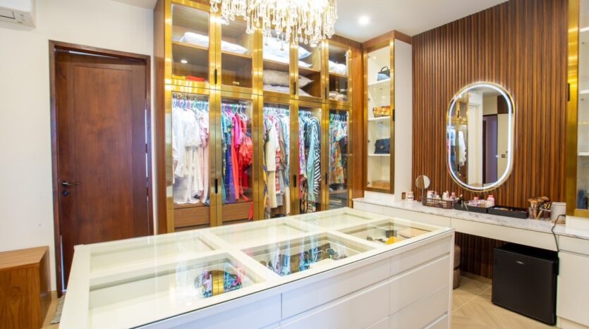ห้องนอนใหญ่ชั้นล่าง พร้อมตู้เสื้อผ้าแบบวอล์คอิน และห้องน้ำในตัวที่หรูหรา