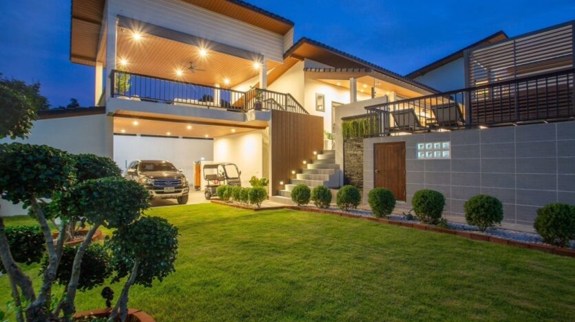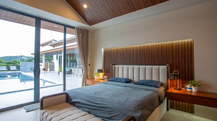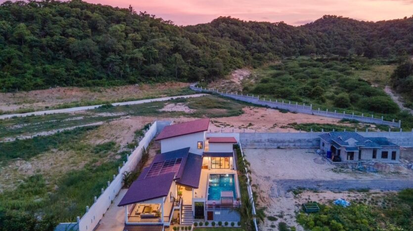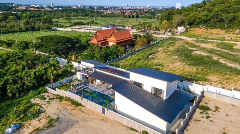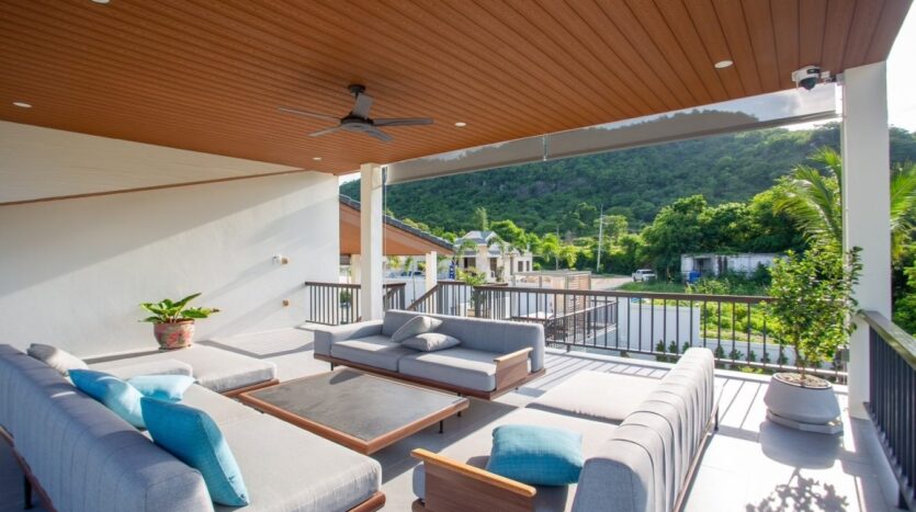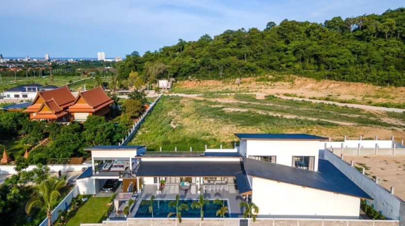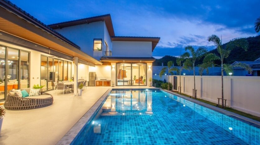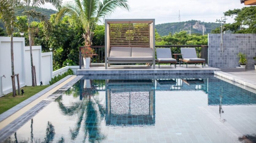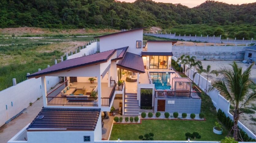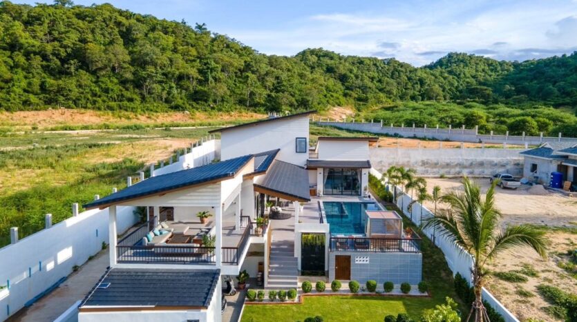 This luxurious 5-bedroom, 6-bathroom modern pool villa has been meticulously designed for both elegance and functionality. Completed in 2024, it’s situated in a peaceful location with breathtaking mountain views and glimpses of the sea, just minutes from Hua Hin town and the beach.