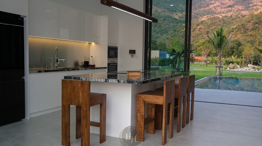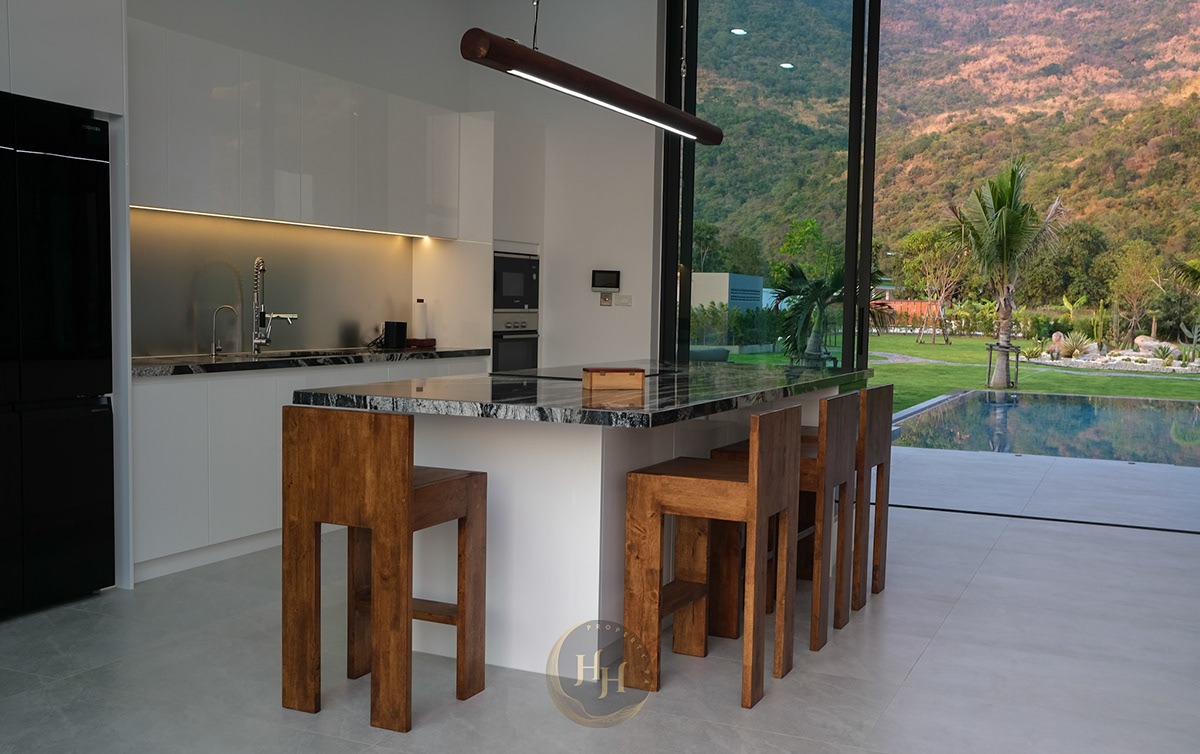 Inside the villa, the design emphasizes quality and comfort, with handcrafted solid wood furniture, granite surfaces and premium finishes throughout. The modern kitchen is fully equipped with a granite island, Bosch oven and microwave, dishwasher, induction hob, and a wine cellar, making it perfect for both everyday living and hosting.
